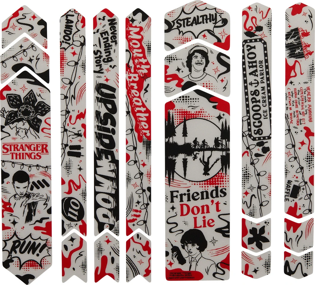 Diese All Mountain Style Frame Guard Full Rahmenschutzaufkleber sind ein umfangreiches Set für Fans der Serie Stranger Things. Die 18 Aufkleber, die ideal für E-Mountainbikes und Downhill-Bikes sind, bestehen aus hochstabilem, selbstklebendem und halbfestem PVC. Die Honigwaben-Struktur gibt ihnen zusätzlich eine schlag- und abriebfeste Oberfläche. Die verschiedenen Formteile lassen sich auch auf schwierigen Rahmenformen anbringen und helfen, Dein Bike vor Beschädigungen zu schützen.