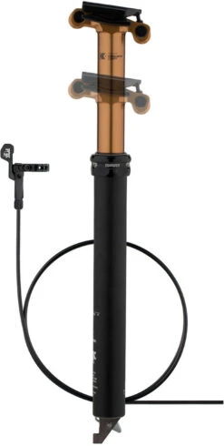 Die Transfer Factory Vario-Sattelstütze von Fox Racing Shox mit Genuine-Kashima-Coat-Beschichtung und 100 mm Hub glänzt mit geringer Gesamtlänge und Einstecktiefe. Das macht sie kompakter und leichter. Zwei unterschiedliche Hebeldesigns sorgen dafür, dass die Sattelstütze zu jedem Antrieb passt. Der Bowdenzug zur Ansteuerung wird innen verlegt. Zudem wurde die Wartungsfreundlichkeit verbessert.
