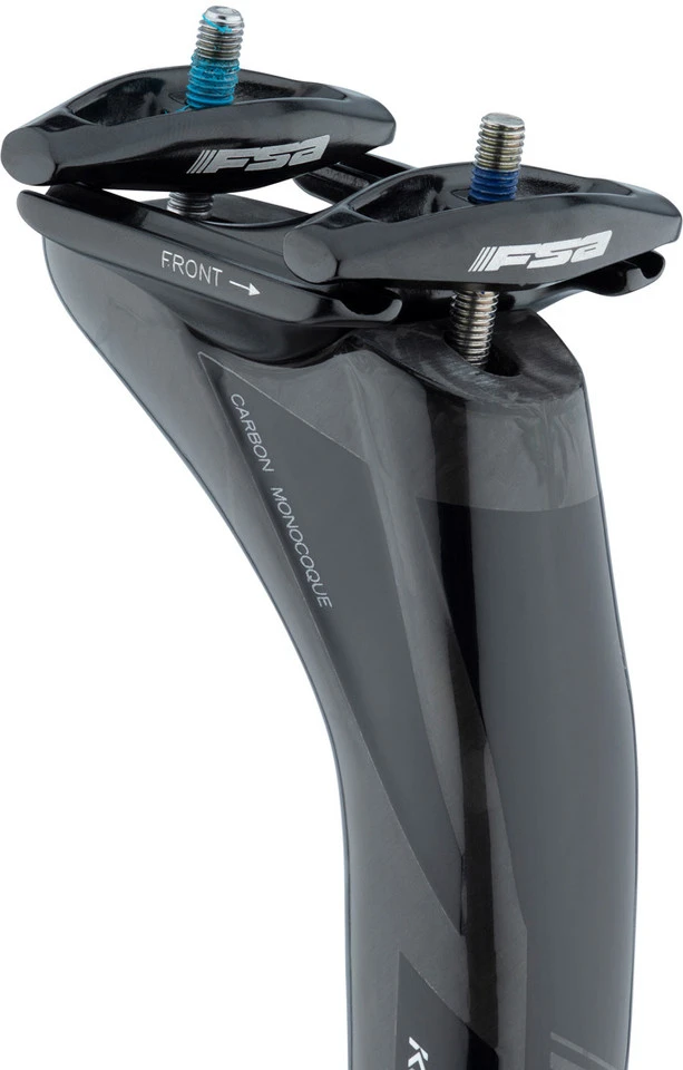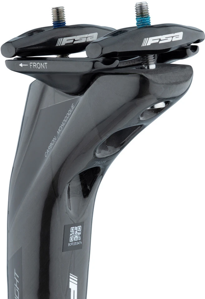 Die K-Force SB25 MTC Carbon Sattelstütze von FSA weist einen Setback von 25 mm auf, basiert auf einer gewichtssparenden einteiligen Konstruktion und kommt mit einem leicht einstellbaren, flachen Klemmkopf aus Aluminium.