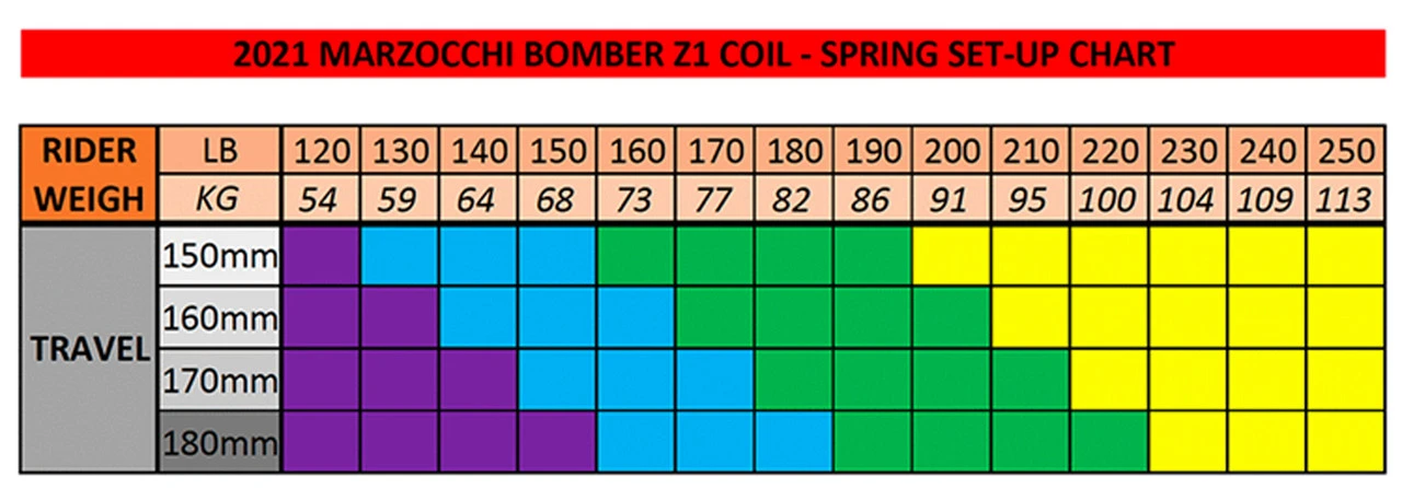 Mit der Bomber Z1 Coil bietet Marzocchi eine Federgabel an, mit einer speziell gehärteten, superleichten Silizium-Chrom-Stahlfeder. Die Vorspannung der Feder erfolgt über die Topcap und ist rein dazu da den Sag (Negativfederweg) an das Fahrergewicht anzupassen, hat jedoch keinerlei Einfluss auf die Federrate. Neben dem typischen M-Gabelbrücken-Design, bietet die Gabel einen Standrohrdurchmesser von 36 mm, einen Federweg von 150 mm bis 170 mm und eine Grip-Dämpfung mit einstellbarer Druck- und Zugstufe. Alle Gabeln werden mit einer Medium Feder ausgeliefert.