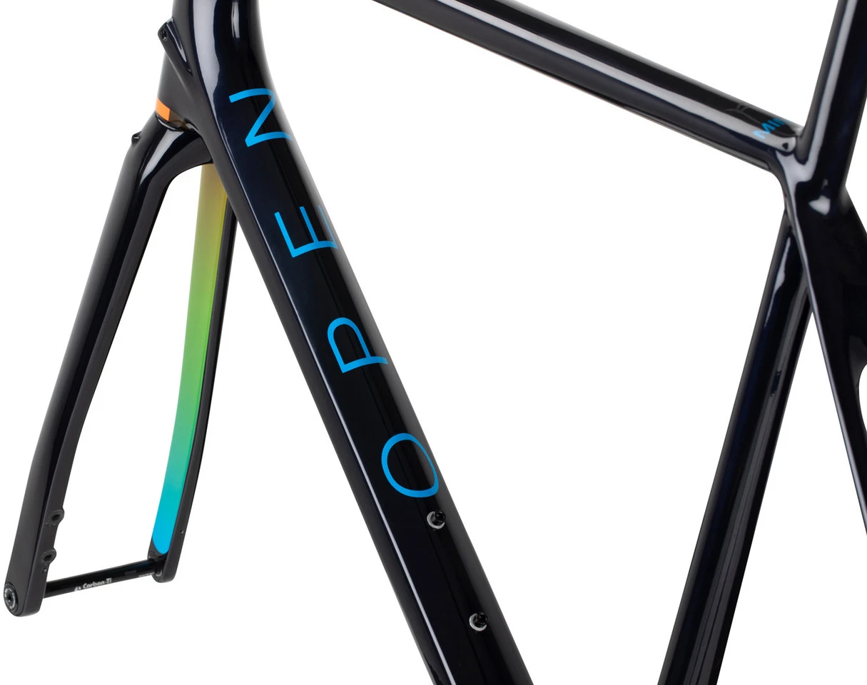 Das OPEN MIN.D. Rahmenkit aus Carbon ist die ideale Ausgangsbasis für ein gewichtsoptimiertes Rennrad. Beim Rahmendesign fällt besonders die Sattelstütze ins Auge, die mit dem Sitzrohr zusammen aus einem Stück gefertigt ist. Die nahtlose Verbindung schafft herausragenden Sitzkomfort und ist mit nur 25 mm Durchmesser besonders gewichtseinsparend. Für das Finetuning kannst Du die Sattelstütze nach Kürzung um bis zu 15 mm anpassen. Das effiziente Layup mit Carbon-R-Turn-Gabel wahrt das passende Verhältnis zwischen Steifigkeit und Langlebigkeit. Das Endprodukt ist bereit für High-Performance auf der Straße. Mit bis zu 32 mm Reifenfreiheit bist Du auch für rauen Asphalt und leichte Schotterpassagen gewappnet. Frühjahrsklassiker und schwierige Alpenpässe meisterst Du mit Leichtigkeit. Die interne Zugverlegung sorgt nicht nur für einen cleanen Look, sondern überzeugt auch in Sachen Aerodynamik.