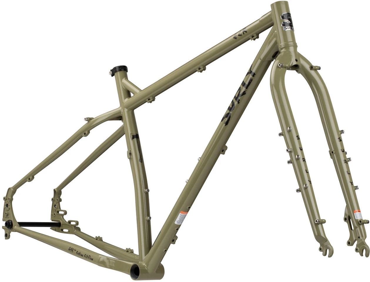 Spezifikationen:Einsatzbereich:Touring/Trekking, Cross CountryLaufradgröße:29+Rahmengrößen:M, L, XLMaterial Rahmen:Stahl (4130 CrMo)Material Gabel:Stahl (4130 CrMo)Technische Daten:Einbaubreite Hinterrad:142 mm, 148 mm (Gnot Boost)Achsstandard:12 mm SteckachseSattelstütze (Ø):27,2 mmSattelklemme (Ø):30,0 mmSteuersatz:EC34/28,6 – EC34/30Gabelschaft empf.:1 1/8″Gabeleinbauhöhe:468 mmInnenlagerstandard:BSAGehäusebreite:73 mmBremsaufnahme:Disc ISUmwerferaufnahme:Low Clamp (Schelle 28,6 mm), Direct Mount (High-Direct)Flaschenhalteraufnahmen:3Zubehöraufnahmen:Ösen für Gepäckträger und SchutzblecheTechnische Daten Gabel:Gabelschaft:1 1/8″Achssystem:Schnellspanner (9 x 100 mm)Bremsaufnahme:Disc ISVorlauf:47 mmSchaftlänge:260 mmEinbauhöhe:468 mmEinbaubreite:100 mmGabelkronendurchmesser:30 mmMaterial Gabelschaft:Stahl (4130 CrMo)Material Gabelbeine:Stahl (4130 CrMo)Zubehöraufnahmen:Ösen für GepäckträgerFreigaben:Gewichtsbeschränkung:138 kg (Fahrer und Gepäck)Scheibenbremsgröße max.:203 mm (VR), 160 mm (HR)Reifengröße max.:3,0″ (mit Schutzblechen)Kettenblattanzahl:3-fach, 2-fach, 1-fachKettenblattgröße max.:3-fach 22-34-44Z, 2-fach 26-39Z, 1-fach 34Z (Mitte), 44Z (außen)Gabeleinbaulänge max.:485 mm (Starrgabeln), 527 mm (Federgabeln)Features:WIG-geschweißt, ED-beschichtetdoppelt konifiziertes HauptdreieckSurly Trip Guide Zug-/Leitungsführungenhorizontale Ausfallenden (mit Rohloff Aufnahme)zwei normale und eine 3-Ösen-Flaschenhalteraufnahme3-fach nur möglich mit 2,5″ oder schmaleren ReifenASTM-Kategorie 3Technologie:Gnot Boost: